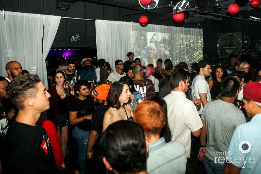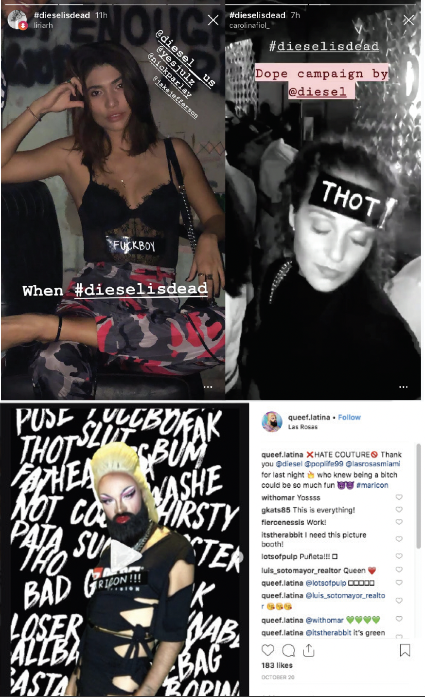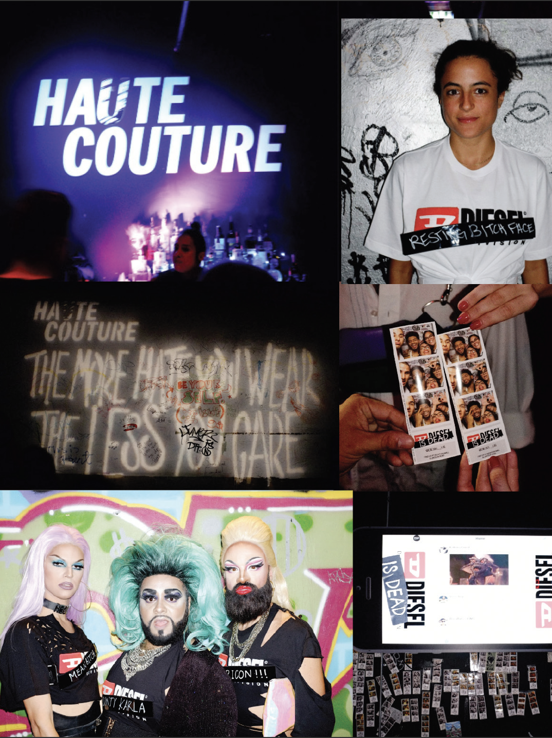 Guests were greeted with a choice of hate nametag and then proceeded to enjoy an open bar in the holding room. A Hate Feed on a oversized iPhone LED screen scrolled diss tweets while “burners” dressed in drag graced the room with their sass. The Customization Station claimed a stake in the outside patio where a limited amount of personalized tees were gifted. At 12:30 the live room opened to reveal at transformed DJ booth + and stage area with Diesel branded art installations and content.