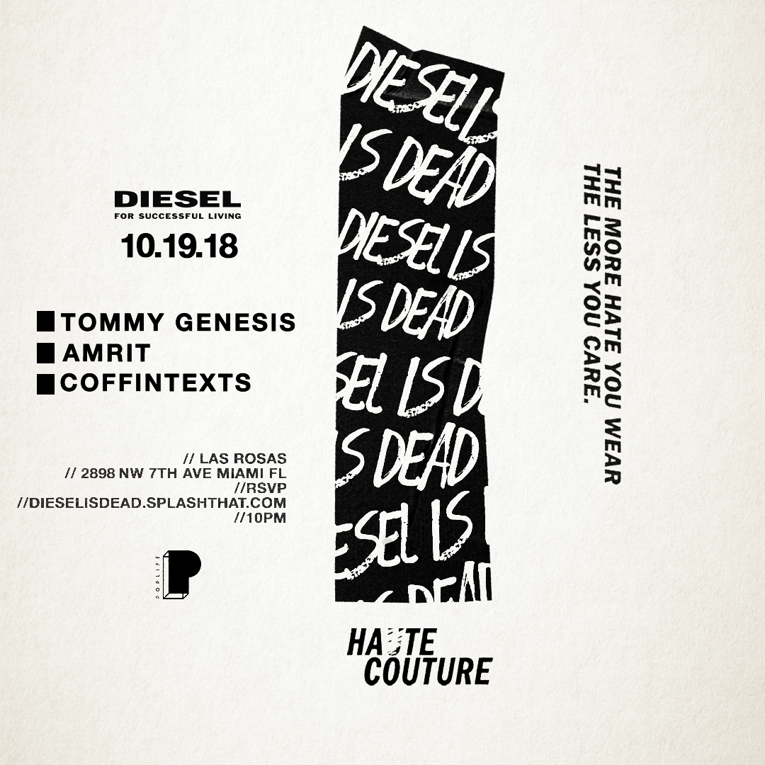 Diesel is Dead celebrated the brand’s FW18 Haute Couture line by throwing a party embodying the campaign’s slogan “the more hate you wear the less you care.” We were tasked with Conception an idea for the event based off this slogan on behalf of Diesel and executing it from start to finish. The party Featured a live performance by Tommy Genesis and DJ sets by Amrit, Coffintexts, and Loka.